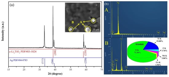 The chemical compatibility is an important criterion to determine whether ceramics can be used as LTCC materials. To study the chemical compatibility of LTCN + x wt% LiF ceramics, 20 wt% Ag powder was mixed with LTCN + 3 wt% LiF ceramic powder, these powders were pressed into the cylinder and were sintered at 950 °C for 3 h. The results of XRD, SEM and EDS elemental analyses of LTCN + 3 wt% LiF co-fired with silver are shown in Figure 7. It is obvious from Figure 7a that the XRD pattern matches well with the diffraction peaks of c-Li2TiO3 (PDF # 03-1024) and Ag (PDF # 04-0783), and no impurity phase appears. From the inset of Figure 7a, the brighter A and the darker B are clearly separated. According to the EDS elemental analysis results of points A and B in Figure 6b, point A is the monolithic Ag and point B is the LTCN + 3 wt% LiF ceramic, implying that there is no chemical reaction between the ceramic and Ag. Hence, the LTCN + 3 wt% LiF ceramic is a promising material for LTCC applications.