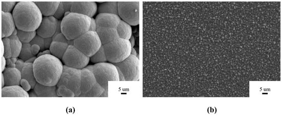 For the purpose of the following description, the diamond grains prepared on the powder are referred to as P-diamond, and the diamond grains prepared on the sintered Si3N4 insert are labeled as S-diamond, and their SEM images are shown in Figure 1. It can be seen that the Si3N4 powder substrate was covered by the spherical diamond grains with a diameter of 15–20 µm, which was larger than those reported in the previous literature []. To the best of our knowledge, such a P-diamond ball might be the largest in the current deposition process, which might mainly result from the special physical properties of the discontinuous powder substrate. For the sintered Si3N4 substrate, the S-diamond coating was well deposited with a normal flat {111} crystal plan, which showed the similar surface morphology of the classical microcrystalline diamond (MCD) coating []. As compared with the P-diamond coating, the S-diamond coating exhibited a dense surface without any hole. Hence, although the common consensus was reached on the fact that the surface roughness significantly affects the surface morphology of CVD diamond coating, the discontinuous surface substrate still induced a very interesting and special behavior of motiving the fabrication of the large spherical diamond grains that was never observed before.