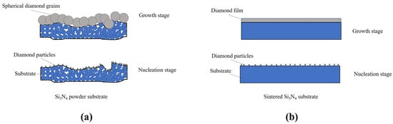 In this work, we were devoted to the deep investigation on the mechanism of the considerable discrepancy in surface morphologies between P-diamond coating and S-diamond coating. It was noted that the main difference between these two diamond coatings was the case of whether the substrate was a discontinuous surface or not. Here, a hypothesis was proposed to describe the growth process of P-diamond coating. Meanwhile, the S-diamond coating was also considered for comparison. Figure 3 shows the proposed schematic procedure of diamond growth. Although the Si3N4 powder substrate was mechanically pressed under a larger load, and thus flattened the substrate surface prior to deposition, it was still an uneven surface at the microscopic scale. Many large holes were distributed on the surface of powder substrate as compared to the sintered substrate. The coupling between inhomogeneous materials and discontinuous surface might cause difficulties in the epitaxial growth of diamond grains in the horizontal direction. In addition, during the deposition process, the carbon atom reactive groups gathered more easily in the recesses of the substrate surface before the nucleation stage, which led to the difficulty of diamond nanoscale nucleation sites to spread uniformly over the whole surface, and thus aggregated mutually to grow into larger spheres. In contrast, the sintered Si3N4 insert can present a smooth and flat surface by polishing, as shown in Figure 3b. The flat surface enabled the diamond crystal nucleus to form larger crystals by diffusion and migration after stabilization in the nucleation stage, which in turn generated a continuous surface uniformly over the entire substrate.