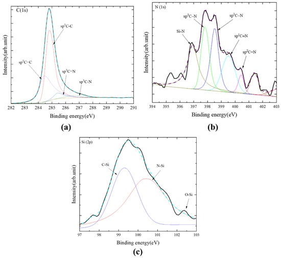 The elements in the P-diamond grains were evaluated by XPS and their chemical states were also detected, as shown in Figure 6. Meanwhile, the deconvolution of the high-resolution spectra was also performed based on Shirley background subtraction. The C (1s) spectrum of the diamond grains were decomposed into four parts located at 284.4, 284.8, 285.6, and 287.2 eV, which were associated with sp2 C=C, sp3 C-C, sp2 C-N/C=N, and sp3 C-N, respectively []. The sp3 C-C component had a larger peak area rate (62.8%) as compared to the sp2 C=C component (27.4%), indicating that the diamond coating contained many non-diamond bonds []. The sp2/sp2 C=N and sp3 C-N peaks formed during the nitridation process are 9.82% of the total area due to the deposition of polycrystalline diamonds on the loose Si3N4 powder substrate in a high-temperature environment, which had affected the bonding structure []. In addition, the peak located at ~283.2 eV (associated with Si-C bonding) was not found in the XPS spectrum, which indicated no Si-C bonding existed in the grains. For the N (1s) spectrum, it was decomposed into five parts located at 397.4, 397.9, 398.5, 399.3, and 400.1 eV, as shown in Figure 6b, which were associated with Si-N, sp3 C-N, sp3 C-N, sp1 C≡N, and sp2 C=N, respectively. Meanwhile, the C-N, C=N and C≡N bonds were also found in the N (1s) spectrum, which was consistent with the results in the C (1s) spectrum. For the Si (2p) spectrum, the two peaks located at 100.9 and 102.0 eV were associated with the Si-C and Si-N bonds, respectively. This further demonstrated the existence of Si-N bonds in the diamond coating. However, the Si-C component existed in the Si (2p) spectrum was not found in the C (1s) spectrum, which may result from the small amount of Si-C bonds in the diamond coating [].