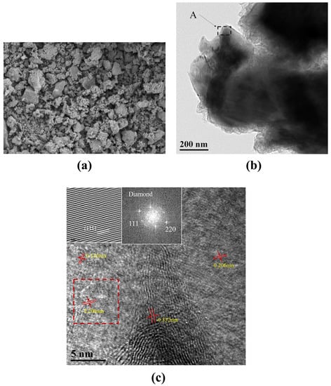In order to investigate the tribological and grinding properties of the P-diamond, the larger diamond particles were shattered and further observed by SEM, as shown in Figure 7a. The characteristic diameters of most particles in the broken diamonds can be observed to be no more than 10 μm. The TEM image of broken diamond grains is shown in Figure 7b, and the high-resolution image of region A was shown in Figure 7c. The interplanar spacings of the diamond layers was 0.206 nm, which was close to the {111} plane. In addition, wavy streaks with interplanar spacings of 0.332 nm existed in the bottom middle part of Figure 7c, which might be related to the graphite layers produced during the breaking of P-diamonds. Moreover, a few grains displaying 2D lattice stripes can be seen, and the lattice plane index and normal direction can be determined from the lattice stripe distance. The region shown in the dashed box in Figure 7c was enlarged in the inset. The Fast Fourier Transform (FFT) of this region was located in the upper left side, and the {111} and {220} lattice planes can be easily identified, which were in general agreement with the XRD results.