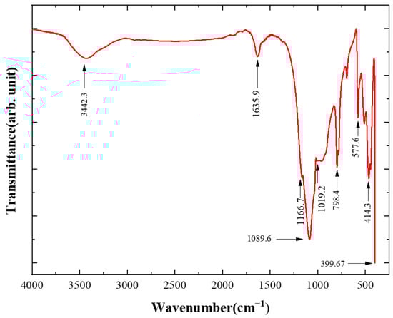 Fourier transform infrared (FTIR) spectroscopy was commonly performed to characterize the bonding structure of atoms and to measure radiation frequencies through the interaction of infrared radiation and matter. This method was applied in this work to detect the chemical bond composition in P-diamonds, as shown in Figure 8. The peak at 3442.3 cm−1 was mainly caused by the combined in-plane stretching vibration of the N-H and C-H groups in diamond [,]. The peak at 1635.9 cm−1 had been confirmed as a result of the in-plane bending vibration of the O-H groups in diamond grains []. The peaks at 1019.2, 1089.6, and 1166.7 cm−1 were attributed to the tetrahedral vibrations of the O-Si-C bond. Among them, the peaks at 1019.2 and 1166.7 cm−1 were caused by the bending deformation vibration of the O-Si-C bond within the base plane, while the peak at 1089.6 cm−1 was induced by the stretching vibration of the O-Si-C bond perpendicular to the base plane []. In addition, the peak at 798.4 cm−1 was related to the out-of-plane deformation of the sp2 hybridized C-H groups, while the peak at 577.6 cm−1 was thought to be due to the rotational lattice vibration of the -OH group []. The peaks at 414.3 and 399.67 cm−1 were associated with the out-of-plane bending vibrational deformation of the sp3 hybridized C-C bond.