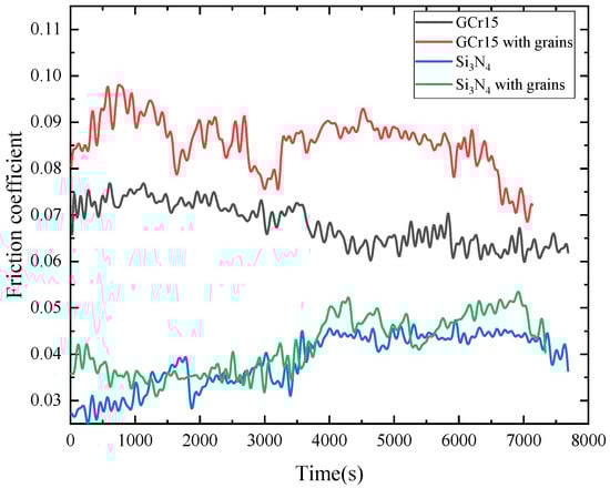 Figure 9 shows the friction coefficient curves of the samples in the four sets of experiments. The average values of the friction coefficients of GCr15 with grains, GCr15, Si3N4 with grains, and Si3N4 were 0.0858, 0.0680, 0.0418 and 0.0387, respectively. According to the values obtained, the friction coefficients of all GCr15 materials were greater than those of the Si3N4 materials, indicating that the deposited diamond grains were more suitable for the Si3N4 ceramic materials in terms of friction and wear reduction applications. In addition, all the GCr15 materials showed a trend of decreasing friction coefficients after one hour of testing, and the GCr15 with grains exhibited more reduction. The Si3N4 with grains and Si3N4 exhibited close friction coefficients, with the former increasing by 8% compared to the latter. However, the two groups of experiments in Si3N4 materials still exhibited partially different trends in terms of friction coefficients. The friction coefficient of the Si3N4 set increased by about 0.01 after the friction experiment was conducted for 1 h. Moreover, the friction coefficient of the Si3N4 with grains remained invariant, which indicated that the diamond grains in the oil sample can prevent the friction coefficient from increasing. It was notable that the values of friction coefficients of the four samples were relatively constant after about 4000 s, which was probably due to the protective effect of the oil film gradually formed by the lubricant on the surface after a long period of friction experiment [,]. Meanwhile, the mixture of solid additives and liquid lubricants could also form a protective friction layer to reduce friction and wear.