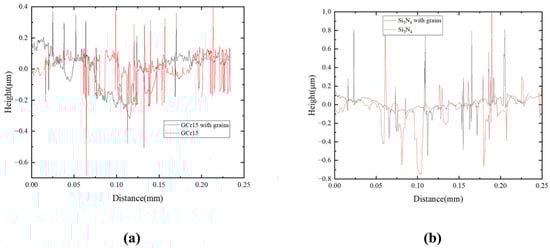 The tribological properties of diamond grains were further evaluated using white light interferometry, and the 3D morphology and 2D profile of the wear grooves of GCr15 and Si3N4 materials after being examined are depicted in Figure 10 and Figure 11, respectively. The deep wear grooves can be clearly observed in the GCr15 with grains set, as seen in Figure 10a, whereas it was not apparent in GCr15 set, as shown in Figure 10b. The Ra of the wear surface of GCr15 with grains was 0.101 μm compared to 0.077 μm for GCr15 in Figure 11a, with an increase of 31.17% for GCr15 with grains set. In addition, the wear surface Ra of the Si3N4 with grains set was 0.065 μm, and the wear surface Ra of the Si3N4 set was 0.146 μm, as shown in Figure 11b. The surface roughness of the Si3N4 with grains set had been reduced by 124.62%, which might be caused by the low hardness of GCr15, resulting in the surface being plowed by diamond grains during the friction process. However, the Si3N4 ceramics were so hard that the diamond grains form a protective layer on the surface and replaces it during the friction process.