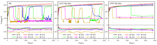 Figure 1 shows the cell potential–time responses of the pure magnesium and AZ31 and AZ 91 magnesium alloys during PEO under R ratios from 0 to 3.2 for 2400 s. In the initial period, the anodic potential of the pure magnesium at different R values rapidly increased at a nearly linear rate to ~500 V. Then, the rising rate of the anodic potential was significantly reduced, accompanied by the appearance of sparks. However, in the subsequent PEO stage, there were differences in the cell potential–time curves for different R values. The anodic potentials of R = 0 and R = 0.6 increased slowly to the final values of 577 V and 631 V at 2400 s, respectively. During most of the PEO period, the potential at R = 0.6 remained higher than that at R = 0. However, the potential at R = 0.9 did not rise continuously. At the PEO time of 760 s, the potential at R = 0.9 suddenly decreased from ~571 V to ~224 V, accompanied by a weakening of the plasma discharges. Afterwards, the potential remained at relatively low values (~200 V), with fluctuations being observed, and this stage lasted for ~385 s. At ~1145 s, the anodic potential rose again, reaching 524 V at 1242 s, accompanied by the reappearance of strong sparks. Afterwards, the potential decreased again at ~1857 s. Visual observation showed that the decrease in the potential was due to the destruction of the coating. However, after the coating was completely detached from the sample, strong sparks reappeared and the potential rose again. The cell potential–time responses of the pure magnesium at higher R values were similar to that at R = 0.9, except for an earlier decrease at greater R values. In addition, the cell potential at R = 1.6 did not show recoveries after the potential dropped.