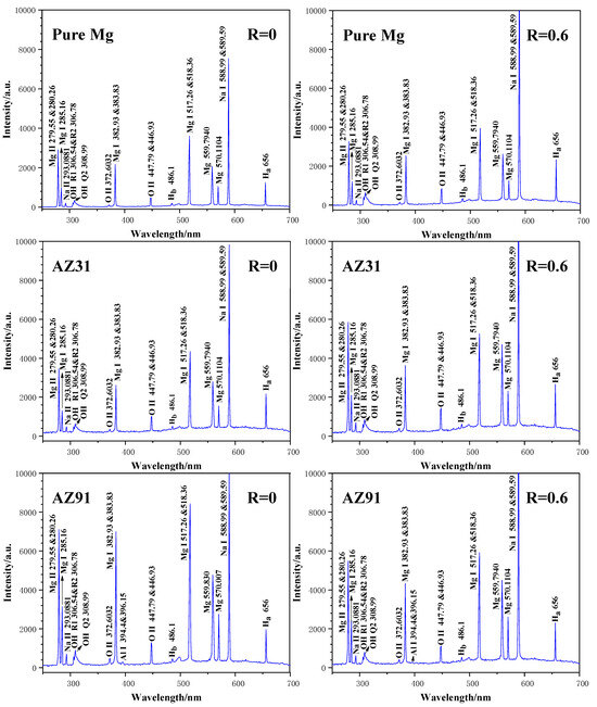 Figure 3 shows the OES spectra recorded at 600 s for the pure magnesium and AZ31 and AZ91 magnesium alloys at R = 0 and R = 0.6. The results indicate that, in the sodium silicate solution, the strongest emission lines collected for the pure magnesium at R = 0 were the Na I lines at 588.99 and 589.59 nm. Characteristic emission lines of other elements from the electrolyte, such as O II and Há, Hâ and OH, were also present on the spectrum. In addition, multiple spectral lines of Mg, which came from the substrate, were recorded. It is worth noting that we attribute the two spectral lines at 559.79 and 570.11 nm to Mg. However, databases and the literature do not show the presence of spectral lines at the two positions for species of Mg. The assignment to the Mg lines is based on our deduction. We collected the emission spectra of pure Al in the same solution, showing the absence of the two spectral lines. Therefore, it can be ruled out that these two spectral lines came from the electrolyte. As a result, we can only attribute the two spectral lines to the substrate metal (Mg) at present. The spectral lines collected for the pure magnesium at R = 0.6 are almost identical to those at R = 0.