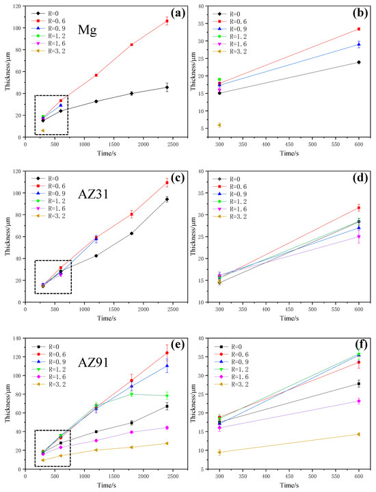 Thicknesses (eddy-current method) as a function of time for the PEO coatings formed under different R ratios on (a) pure magnesium and (c) AZ31 and (e) AZ91 magnesium alloys. (b,d,f) are the boxed regions in (a,c,e), respectively.