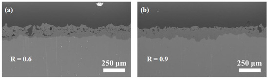 Uniform PEO coatings could be formed for longer times on the AZ91 magnesium alloy up to a high R ratio of 3.2. Figure 10 compares the cross sections of the coatings formed for 2400 s under R = 0.6 and R = 0.9. The coatings formed under R = 0.6 have a few elongated pores within the cross section. However, the elongated pores are significantly reduced within the cross section under R = 0.9. Therefore, a higher R is beneficial for the growth of denser coatings with fewer defects on AZ91 magnesium alloy.