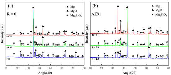 (a) A comparison of the XRD patterns of the coatings formed for 2400 s under R = 0 on pure magnesium and AZ31 and AZ91 magnesium alloys. (b) XRD patterns of the coatings formed on AZ91 magnesium alloy for 2400 s under R = 0, 0.6 and 1.2.