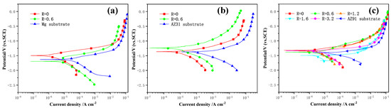 Polarization curves of the uncoated substrates and the PEO coatings on (a) pure magnesium and (b) AZ31 and (c) AZ91 magnesium alloys formed for 2400 s under different R ratios.