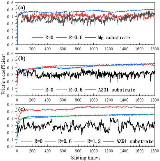 For the uncoated and coated AZ31 alloy samples, only the substrate showed fluctuations in the friction coefficient, the values of which remained between approximately 0.28 and 0.36. The curves of the friction coefficients for the oxide coatings formed under R = 0 and R = 0.6 are higher than that of the substrate, and the curves are relatively stable. Moreover, their values are very close, showing values of around 0.45 for the later stage of the friction tests.