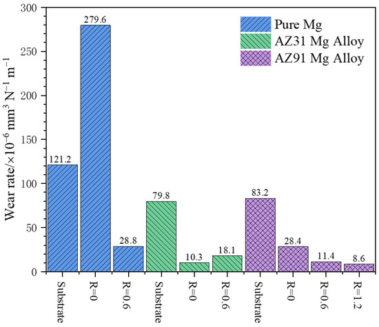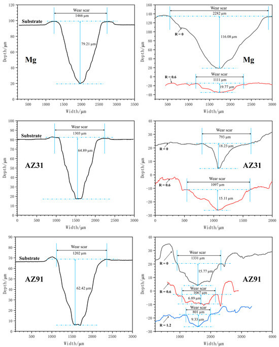 Figure 16 shows the appearances of the different samples after the dry sliding tests. It can be seen that all the metal substrates and the R = 0 coating on the pure magnesium are heavily worn, showing broad wear tracks with metallic luster. Except for the coating formed on the pure magnesium under R = 0, all the coated samples formed dark-brown wear tracks. The dark-brown wear tracks are the “transfer layers”, which were formed due to material transfer and the tribo-oxidation of the steel counterpart under the combined action of mechanical stresses and frictional heating [64]. For the pure magnesium and AZ91 magnesium alloy, the coatings formed under R = 0.6 exhibit narrower wear tracks than the coatings formed under R = 0, indicating the better wear resistance of the former. However, for the AZ31 alloy, the coatings formed under R = 0 and R = 0.6 show comparable wear tracks in width. It is noted that the narrowest wear track is found with the coating formed under R = 1.2 on the AZ91 magnesium alloy.