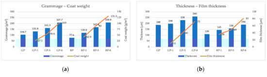 | Sample | Grammage (g/m2) | Thickness (µm) | Density (kg/m3) | Roughness (mL/min) | Air Permeability (mL/min) | Specular Gloss (%) | ISO Brightness (%) |