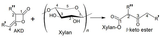 Hydrophobized xylan (XyAKD) was obtained by the reaction of native xylan (Xy) with long-chain anhydrides such as alkyl ketene dimers (AKD), resulting in the formation of β-keto ester compounds with hydroxyl groups of xylan (Figure 1). For the dispersion, 25 g/L of xylan was mixed with a 2.5% solution of AKD and the mixture was magnetically stirred at 1500 rpm at 20 °C for 24 h [25]. The resulting dispersion was used for paper coating.