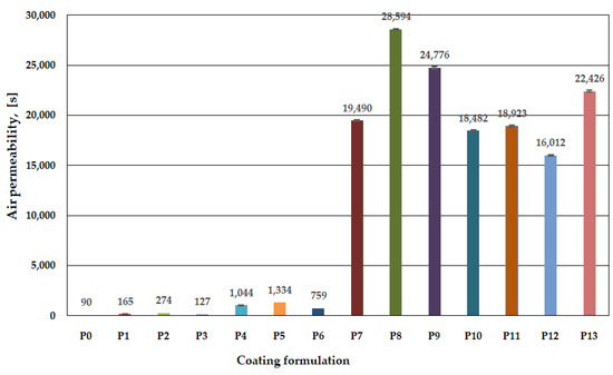 The air permeability of coated paper samples. P0: base paper. Homogeneous coatings in single layer—P1: 100Xy; P2: 100XyAKD; P3: 100XyAc; P4: 75Xy25Ch; P5: 75XyAKD25Ch; P6: 75XyAc25Ch; P7: 50Xy50Ch; P8: 50XyAKD50Ch; P9: 50XyAc50Ch; P10: 100Ch. Composite coatings in two layers—P11: 100Xy + 100Ch; P12: 100XyAKD + 100Ch; P13: 100XyAc + 100Ch.