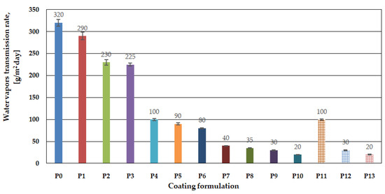 For food packaging materials, the water vapor transmission rate is another important barrier property. Through the transmission of water vapors into a package, the freshness of the packed food could be affected and also the growth of microorganisms is increased. The results of gravimetric measurements of the WVTR are presented in Figure 7.