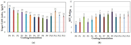 Oil and grease resistance of xylan/chitosan-coated papers. (a) Unger–Cobb index; (b) KIT rating. P0: base paper. Homogeneous coatings in single layer—P1: 100Xy; P2: 100XyAKD; P3: 100XyAc; P4: 75Xy25Ch; P5: 75XyAKD25Ch; P6: 75XyAc25Ch; P7: 50Xy50Ch; P8: 50XyAKD50Ch; P9: 50XyAc50Ch; P10: 100Ch. Composite coatings in two layers—P11: 100Xy + 100Ch; P12: 100XyAKD + 100Ch; P13: 100XyAc + 100Ch.