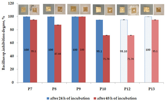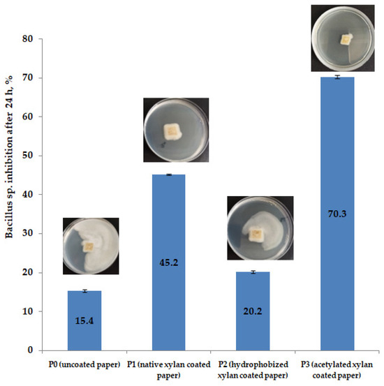 It was observed that the papers coated with the acetylated xylan and chitosan formula (P9) exhibited total inhibition both after 24 h and 48 h. In this case, the acetylated xylan contributed to the improvement of the antimicrobial effect due to the reduction in water affinity by acetylation, as mentioned in recent studies.