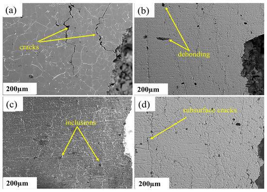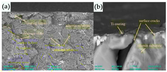 Figure 6a indicates the Ti-coated sample before the fatigue analysis. The crack initiation was transferred from the surface to the subsurface in the fatigue crack initiation, as shown in Figure 6b,c. The microstructures might primarily influence this in the surface layer. With the difference in the elastic moduli and residual stresses between the particles, the inclusions and surrounding second-phase particles caused a local stress concentration during each vibration cycle [43]. As a result, many small voids aggregated into microcracks and formed fatigue cracks in the vicinity of the inclusion and second-phase particles. Transmission electron microscopy was used to examine the coated samples that were subjected to fatigue tests. It was clearly seen that the fatigue tests of the samples were accompanied by a significant transformation of the Al–5%Si layer adjacent to the titanium film (Figure 7). The maximum thickness of the contact layer varied from 0.5 µm to 2.0 µm. It increased monotonically with the increase in the number of fatigue test cycles. The contact layer had many micropores and microcracks, which increased as the number of fatigue test cycles increased.