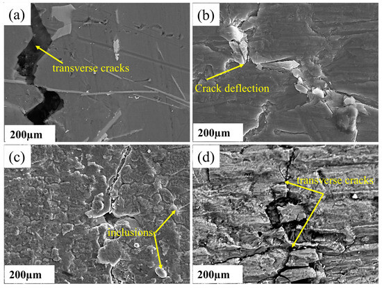 The magnified SEM images of the fatigue-tested samples are shown in Figure 4. The transverse cracks that occurred in all specimens concerning the longitudinal axis were analyzed to evaluate the effect of the fatigue loading. With the increase in the thickness of the coatings, the transverse cracks in all samples were reduced substantially. The average size of the fragments of the Al–5%Si sample and 1 µm Ti-coated sample was 270 µm and 65 µm, respectively (Figure 4a,b). The fragments of the 3 µm Ti-coated sample were in the range of 4.5–18 µm (Figure 4c). Similarly, the size of the fragments in 5 µm Ti-coated sample was in the range of 1–1.5 µm. From the analysis, it is clear that the surface characteristics of the Al–5%Si sample played a vital role in the fatigue behavior.