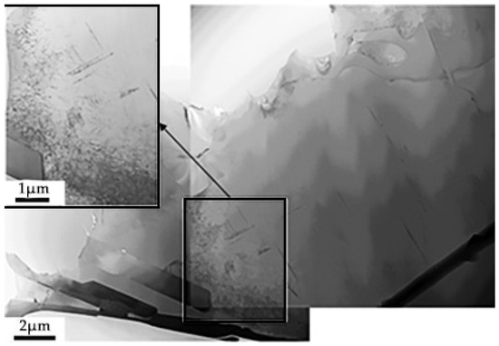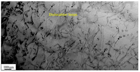 The presence of prismatic dislocation loops was discovered during the studies of the dislocation substructure in the layer adjacent to the fracture surface of the Al–5%Si samples with a pre-deposited titanium film (Figure 16). The lack of contrast within the loops, which is typical of stacking faults, indicated that the loops were formed by complete dislocations [44,45]. A large number of vacancies or interstitial atoms can combine to form dislocation loops [46]. Vacancy dislocation loops are formed during the quenching of metal crystals from high temperatures.