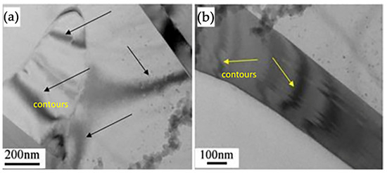 The formation of internal stress fields was influenced by the fatigue loading. The bending extinction contours in the TEM image indicated the presence of identified stress fields, as shown in Figure 11a. The aluminum grain interface and second-phase inclusions dominated the thin foil structure. In the volume of the bending extinction contours, both primary aluminum grains and second-phase inclusions were found to be elastically stressed (Figure 11b).