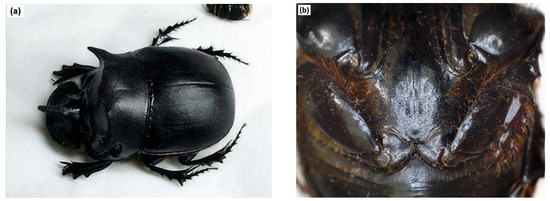(a) Dung beetles for observation. (b) The abdomen of a dung beetle.
