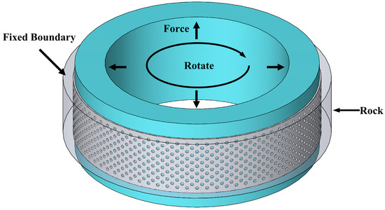 The boundary conditions are set in the load module. The motion path of the drill pipe could only rotate around the Y-axis. Pressure was applied on the inner side. For the rock sample, it is necessary to restrict its movement conditions in all directions, so fixed constraints were imposed. The boundary conditions are shown in Figure 5. The simulation was conducted for a duration of 2 s, with a lateral force of 100 N and a rotational speed of 30 rpm. The basic parameters of the materials used are outlined in Table 2 [30].