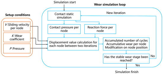 The workflow of ANSYS for wear simulation is illustrated in Figure 6. It mainly consists of two steps: condition setting and wear simulation cycle. Before starting the simulation, the setup conditions inside the red box need to be defined, including the pressure, velocity, and friction coefficients. Since the purpose of the simulation is to compare the two structures, the coefficient of friction remains the same. In the wear simulation cycle, the contact nodes in each iteration are repositioned, each node along the X, Y, and Z direction of the relative displacement of node pressure and the speed is calculated, and then the material from the coating surface is removed to show wear and tear. The iterative process continues until the stable wear phase is reached. If the stable wear phase is not reached, the cycle proceeds to the next iteration, as shown in the blue box [32].