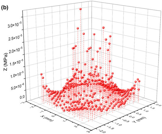 As can be seen from Figure 11, the stress is mainly concentrated on both sides of the rotation direction of the pit unit, forming a fan-shaped influence range that is concentrated within 0.5 mm. In contrast, the stress is relatively small in the vertical direction and beyond 0.5 mm. Additionally, the stress peak value is approximately 6–7 times greater than the minimum stress value. This stress concentration phenomenon can cause failure on both sides of the pit unit and then spread to other areas.