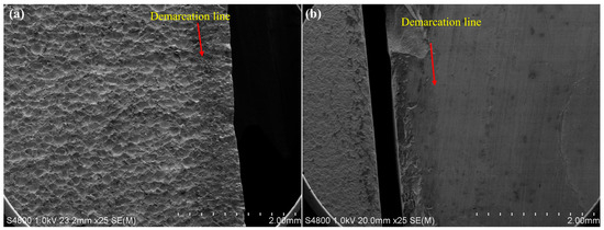 Figure 13 presents the scanning electron microscope images taken before corrosion with the Keller reagent. The image clearly displays a distinct demarcation line between the molten cladding layer and the substrate, both before and after polishing. This demarcation line is indicated by the red arrows in Figure 13a,b. A good metallurgical bonding state exists between the cladding layer and the substrate, and no obvious cracks are observed at the interface bonding before and after polishing. In addition, a small number of pores is found at the bottom of the coating, but overall, the performance of the coating is not affected.