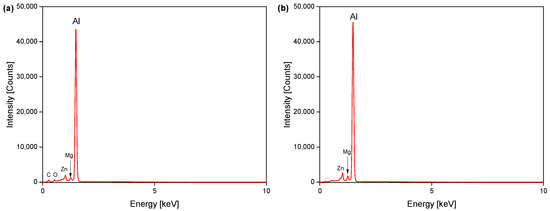Figure 15 shows the SEM micrographs between the substrate and the cladding layer. It shows that the grain size and morphology in the fine crystal zone are significantly different from those in the coarse crystal zone. The grain morphology in the fine crystal zone has an equiaxed crystal distribution with a grain size length from 5 to 10 µm, and the coarse crystal zone exhibits a columnar morphology with grain sizes between 10 and 20 µm. The EDS spectra of point A and point B illustrated in Figure 16 indicate that the composition of both points is primarily Al with some impurities. This suggests that the coarse and fine crystal regions are a result of recrystallization and grain growth during the process of melting and condensation of Al.