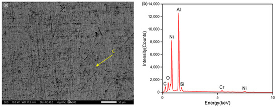 Figure 17a displays the SEM morphology of the cladding layer. It shows a uniformly distributed cast-equiaxed crystal organization without Ni powder particles in the cladding layer. At the same time, there are tiny gaps in the cladding layer. In Figure 17b, the EDS spectra of point C are shown. The primary composition of the clad layer is the Al-Ni phase, with minor amounts of other elements including C, O, Si, and Cr. This can be attributed to the laser cladding process being conducted in a CO2 environment and the presence of impurities in the Ni powder.
