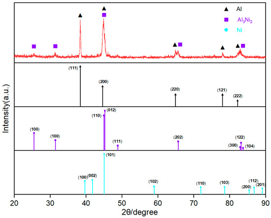 In order to further determine the molten layer products, the cladding layer was analyzed using XRD. The results are shown in Figure 18. Figure 18 indicates that the cladding layer is mainly composed of Al3Ni2 and Al phase. It is worth noting that Ni only has a peak at 45 degrees that overlaps with the identified intermetallic phase, whereas the other angles do not show consistency. Secondly, both Al and Al3Ni2 also overlap with the identified intermetallic phase at the 45 degree peak, and the other angles show a high level of consistency. Lastly, there is no ferromagnetism on the surface of the cladding layer. Based on these observations, it can be concluded that the Ni powder completely reacted with Al to form Al3Ni2.