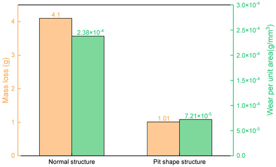 The surface of the two specimens after the wear test is shown in Figure 21. It shows that the area in the middle of the normal structure exhibits significant wear and noticeable shedding, whereas the edge area is relatively complete and has no obvious shedding phenomenon. The pit shape structure is severely worn around the pit unit, and the middle area is also more worn than the edge area. Two kinds of structure surface morphology after the wear test are consistent with the stress distribution in Figure 10, which verifies the accuracy of the finite element model simulation analysis.