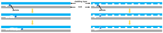 The shedding area of the cladding layer in the normal structure exhibits obvious annular grooves, and no similar phenomenon is observed on the pit shape structure. This difference is attributed to the presence of particles that have not been washed off, which become trapped between the cladding layer and the rock. As a result, these particles undergo abrasive wear as they are cut by the rotating cladding layer. However, due to the existence of pit units, the pit shape structure can store the particles in it, effectively reducing abrasive wear, as shown in Figure 22.