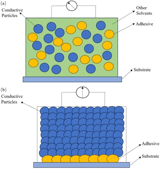 The conductive channel mechanism refers to the conductive channels in the conductive ink, which are formed by the direct contact of numerous conductive particles, resulting in the conductive behavior [16]. Before sintering, conductive particles in the organic carrier of the conductive ink are isolated from each other without the capacity to conduct electricity; during the sintering process of the conductive ink, the nonconductive organic carrier decomposes and volatilizes as the temperature increases, and the adhesive phase melts and contracts after absorbing heat, wetting the conductive functional phase and pulling the conductive functional phase to orderly rearrange through surface tension to achieve the conductive function, as displayed in Figure 1. The conductive channel mechanism, also known as percolation theory, is applicable to the macroscopic explanation of the system with a large percentage of conductive particles added [17]. Via continuously increasing the proportion of conductive particles added to the conductive ink up to a certain amount, the conductive particles that originally dispersed individually in the conductive ink contact each other to form tightly connected chainlike channels that can conduct electricity in all directions, thus substantially enhancing the conductive properties of the conductive ink [18]. There is a special value that indicates the percolation threshold for the addition of conductive particles. The percolation threshold depends on the type of conductive particles, organic carrier, bonding phase, and dispersion state in the conductive ink. The percolation threshold represents the minimum value for which high electrical conductivity via the conduction mechanism occurs. After the percolation threshold, the conductivity would continue to increase by one or more orders of magnitude as a function of filler loading. The printability and as-printed mechanical properties suffer if the loading gets too high. The optimal loading level may be different for diverse materials, applications, and printing techniques. The concentration of conductive particles in metal-based conductive inks often lies between 30% and 80%, and the high-temperature-resistant organic or inorganic chemicals are often chosen to be adhesives [19]. The concentration between 30% and 40% is suitable for inkjet printing. The concentration between 50% and 80% is usually used in screen printing due to the high viscosity. The conductive particle contents of polymer-based conductive ink are between 5% and 30% [20,21]. Polymer-based conductive ink is commonly used to print circuits using inkjet printing technology due to its low concentration. Due to the hydrophobic and agglomerative character of the carbon-based materials, the solids content of the carbon-based materials is usually varied in the range of 2% to 10% [22,23,24]. The concentration of graphene in carbon-based materials for screen printing can be as high as 10%, while its concentration for other printing methods is limited in the range of 2%–6%. To strengthen the conductivity, the solid content of conductive particles was improved from 10% to 30% through the formation of carbon-based composite ink with other excellent conductive metals or polymers [25,26,27]. A solids content of carbon-based composites of 30% is usually applied in screen printing, and a solids content of around 10% is suitable for other printing technologies.