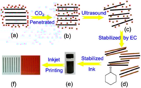 The schematic illustration of the preparation process of pristine graphene ink and its printed electrodes [47]. (a) Layered graphite was immersed in supercritical CO2. (b) CO2 molecules penetrated and intercalated in the interlayer of graphite. (c) The formation of single- or few-layer-thick graphene sheets. (d) Graphene sheets were stabilized via EC in cyclohexanone to (e) form stable graphene ink. (f) Graphene electrodes were printed on PET and PI substrates.