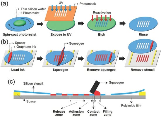 Schematic diagram of graphene ink screen-printing process [60]. (a) Fabrication steps for a thin silicon stencil using a conventional lithography technique. (b) Schematic process of screen printing using a silicon stencil and pristine graphene ink. (c) Cross-sectional illustration of the screen-printing method with the silicon stencil during printing.