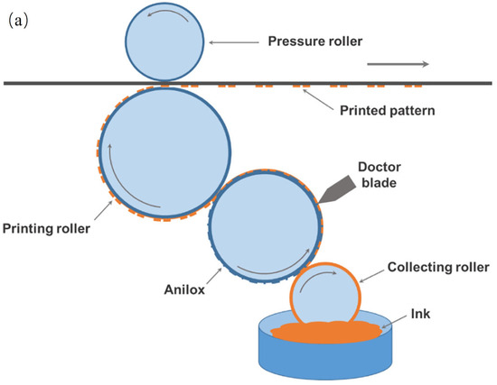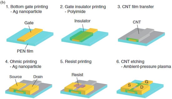 Relief printing, also known as flexographic printing, is a promising roll-to-roll manufacturing technique similar to gravure printing, except that the printing rolls generally consist of rubber or polymeric materials. A representative flexographic printing system includes four rollers, as displayed in Figure 11a. The ink is gathered by a collection cylinder and transferred onto anilox rollers (rollers with engraved patterns). The conductive ink adheres to the circuit pattern on the anilox rollers, with excess ink being scraped away by a doctor blade. The printed circuit pattern is subsequently transferred to the substrate through the printing roller [65]. This direct-contact printing process benefits from printing rollers composed of rubber (or polymer) that are more flexible, which diminishes the impact of the printing rollers on the conductive film, thus minimizing creases and scratches on the substrate. The process is straightforward and industrially scalable, making it ideal for the printing of flexible conductive films, flexible integrated circuits, and electronic components. Higuchi et al. fabricated high-mobility thin film field effect transistors (TFTs) using carbon nanotubes (CNTs) via the flexographic printing technique. Three inks were manipulated during the preparation: (1) Ag ink to generate the gate, source, and drain; (2) polyimide (PI) ink to shape the gate insulator; and (3) resist ink to model the CNTs [66]. CNT films were fabricated using gas-phase filtration and transfer techniques [67]. The process flow of the TFT device manufacturing is shown in Figure 11b. Outstanding quality CNTs are essential in obtaining high-mobility TFTs with 157 cm2 V−1 s−1 because they decrease the number of intertube junctions, which usually have high contact resistance along the pathway. Owing to the roll-to-roll manufacturing process, flexographic printing with high printing speed can be applied to the large-area manufacturing of transistors and combined with inks with different characteristics; it is also anticipated to be utilized in the processing of flexible electronic devices, RFIDs, and other electronic devices.