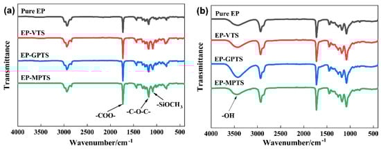 Infrared spectroscopy analysis is an important method to analyze the change of functional groups in EP during polymerization. The infrared spectrum of pure EP and EP blending with silane coupling agents containing different functional groups is shown in