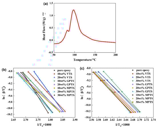 Figure 2a. It reveals that there are two exothermic peaks corresponding to the ACE and AM chain propagation processes mentioned above, respectively. To study the reaction kinetics of the EP system and monitor the change of apparent activation energy during the polymerization process, the DSC curves of each EP system at different heating rates were tested, and the corresponding peak temperatures were recorded. Each DSC curve has similar exothermic peak shapes and different peak temperatures. Thus, Kissinger’s model is adopted for linear fitting to calculate apparent activation energy, as shown in