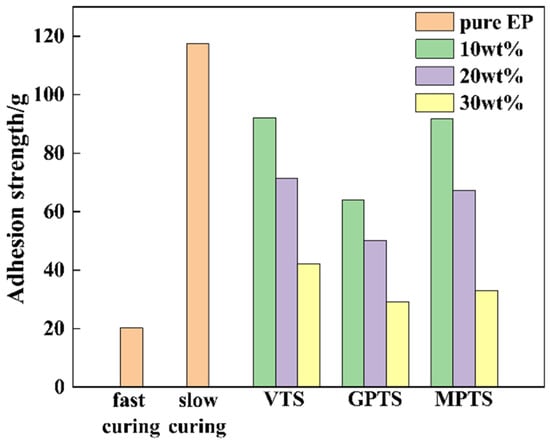 Figure 3 shows the shear strength of EP adhesive blending with different types of silane coupling agents evaluated. The slow curing group adopts the curing process of 60 °C/3 h + 90 °C/3 h + 130 °C/6 h for the pure EP system. At the same time, the fast-curing group and the groups containing silane coupling agents used the curing process of 80 °C/0.5 h + 100 °C/0.5 h + 130 °C/0.5 h. When the silane content is 10 wt%, the order of shear strength was found to be slow curing > VTS ≈ MPTS > GPTS > fast curing, and the values of shear strength are 117.4 g, 92.1 g, 91.7 g, 64.1 g, and 20.2 g, respectively. This is consistent with the results of relevant reports [