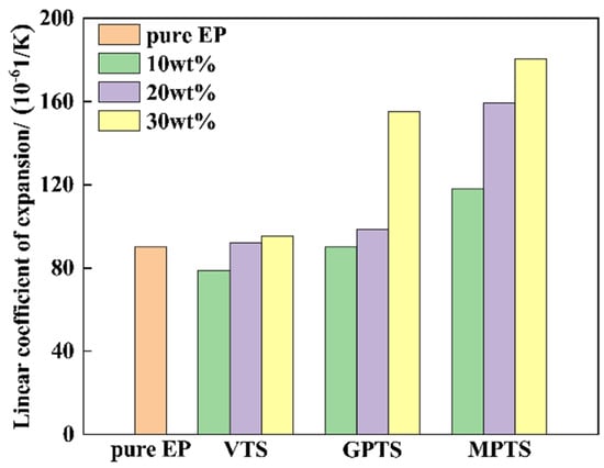 Figure 4. When the silane content is 30 wt%, the order of CTE was found to be MPTS > GPTS > VTS ≈ pure EP and the values are 180.3, 155.1, 95.3, and 90.0 (×10