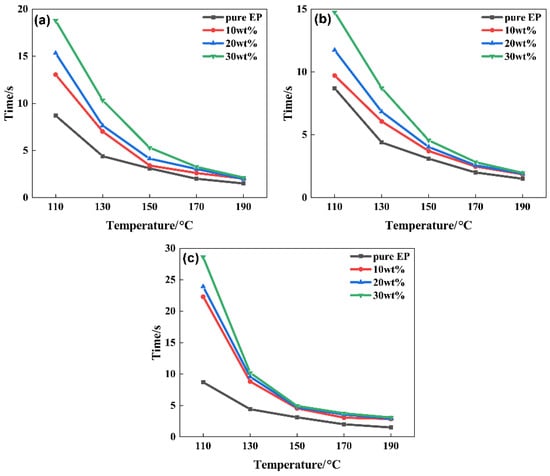 Another factor that causes the deformation of adhesives is the cracks that are generated during the curing process due to the fast curing rate. Therefore, it is necessary to control the curing rate. Gelation refers to the phenomenon of loss of fluidity in a linear polymer system due to the infinite increase in viscosity during the crosslinking reaction process. It is associated with the curing rate of EP. The gelation time–temperature relation curves are shown in