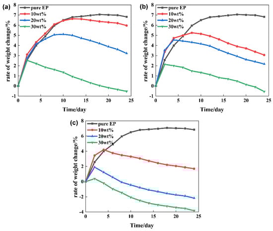 Figure 6. When the content of the silane coupling agent is 10 wt%, the EP-VTS, EP-GPTS, and EP-MPTS systems begin to lose weight on day 12, day 8, and day 4, respectively. For a certain silane coupling agent, the weight is lost earlier with the increase in silane content. That is because the content of the inorganic chain segment in the system increases, resulting in an increase in the degree of phase separation and instability.