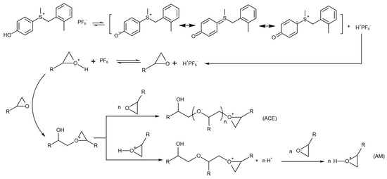 13]. The cationic polymerization of EP consists of a series of reactions. Taking cationic initiator 4-hydroxyphenyl-2-methylbenzyl-methyl sulfonium hexafluorophosphate as an example, the cationic curing agent protonates and produces the strong Brønsted acid HPF6 during the pyrolysis process. This Brønsted acid triggers the ring-opening polymerization of EP in the subsequent process. After a rapid chemical equilibrium with inactive initiators, the active initiators react with epoxy groups, producing active propagating dimer species containing tertiary oxonium ions. Relevant reports suggest that the chain propagation process for EP cationic polymerization consists of activated chain end (ACE) and activated monomer (AM) processes [
