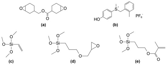 Alicyclic EP (ERL-4221) was supplied by Daicel Co., Ltd. (Tokyo, Japan). 4-hydroxyphenyl-2-methylbenzyl-methyl sulfonium hexafluorophosphate, which was used as a cationic curing agent, was provided by Jiangsu Lingnuoxuan Co., Ltd. (Tongzhou, China). Propylene carbonate was purchased from Sigma-Aldrich (St. Louis, MO, USA). The silane coupling agents, including vinyltrimethoxysliane (VTS), 3-glycidoxypropyltrimethoxysilane (GPTS), and 3-methacryloxypropyltrimethoxysilane (MPTS), were purchased from Sigma-Aldrich. The chemical structures of all of these materials are illustrated in