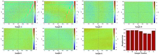 Schematic representation of the surface roughness of samples with different etching processes. The surface morphology of the different samples is given in (A–G), and the statistical average of the roughness of each sample is given in the last figure.