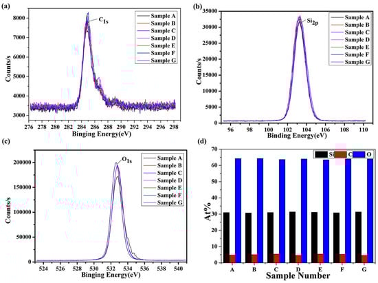 XPS test data plots of samples with different etching processes. Schematic diagrams of the test peaks for the element C1s are given in (a), the test peaks for the element Si2p are given in (b), the test peaks for the element O1s are given in (c), and the statistical curves of the distribution of the content of each element in different samples are given in (d).